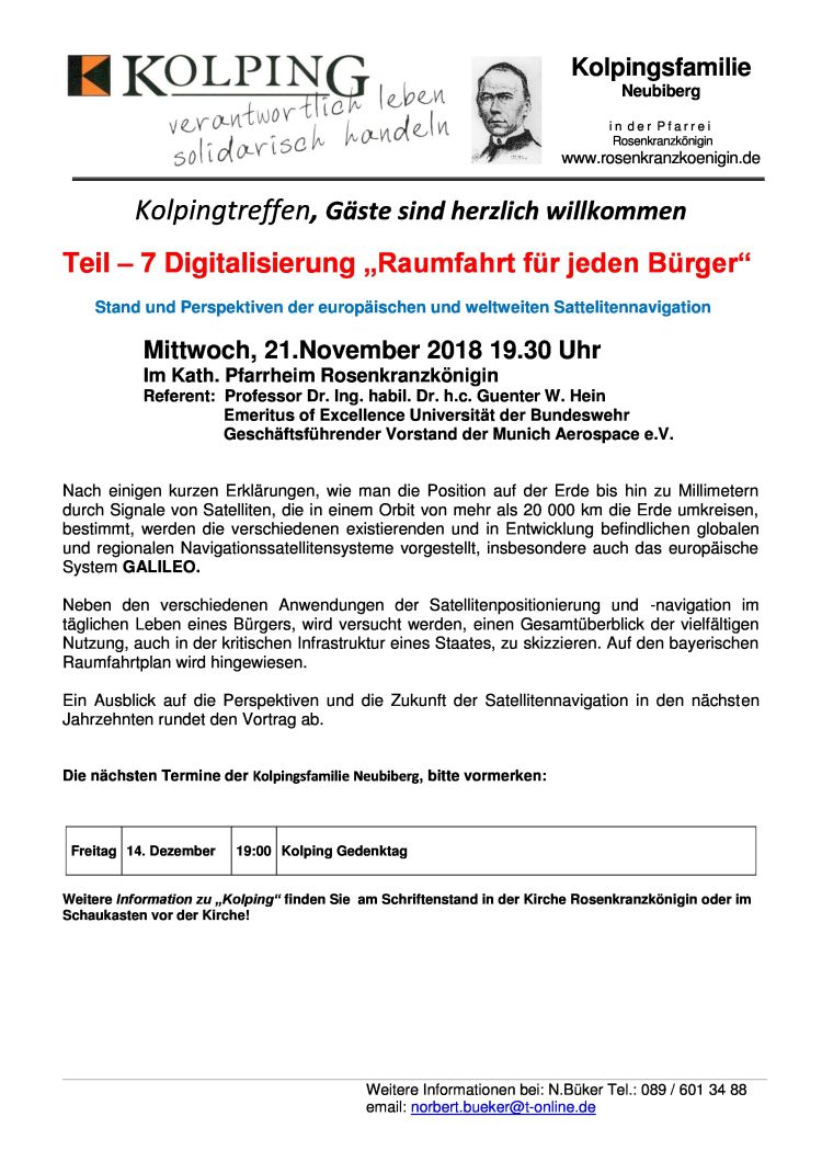 Tag: Mittwoch, den 21. November 2018 Beginn: 19:30 Uhr Referent: Professor Dr. Ing. habil. Dr. h.c. Guenter W. Hein Ort: Katholisches Pfarrheim Rosenkranzkönigin, Kaiserstraße 4b, Neubiberg