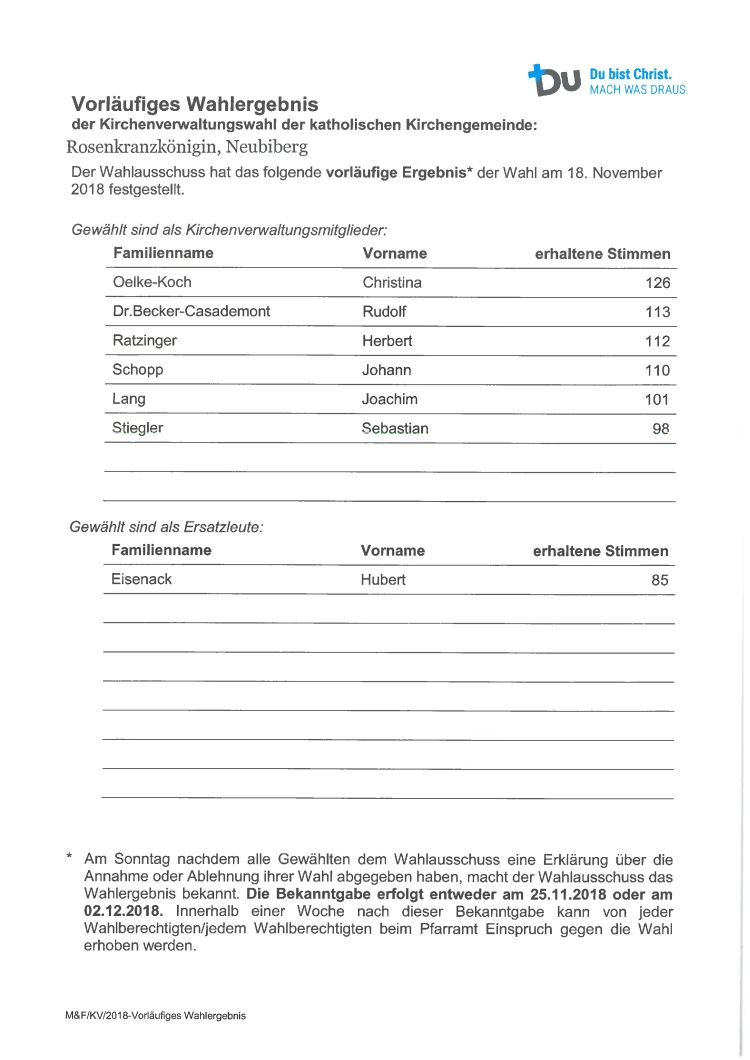Vorläufiges Wahlergebnis Kirchenverwaltungswahl Rosenkranzkönigin
