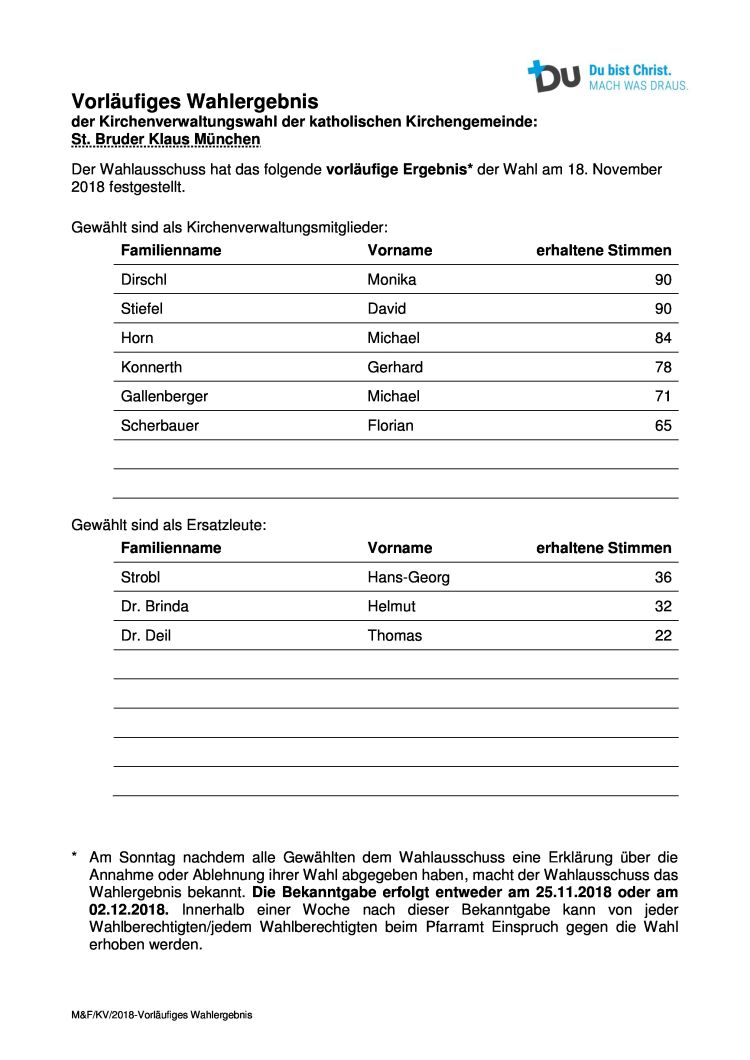 Vorläufiges Wahlergebnis Kirchenverwaltungswahl St. Bruder Klaus
