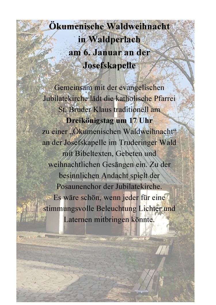 Gemeinsam mit der evangelischen Jubilatekirche lädt die katholische Pfarrei St. Bruder Klaus traditionelll am Dreikönigstag um 17 Uhr zu einer "Ökumenischen Waldweihnacht" an der Josefskapelle im Truderinger Wald mit Bibeltexten, Gebeten und weihnachtlichen Gesängen ein. Zu der besinnlichen Andacht spielt der Posaunenchor der Jubilatekirche.