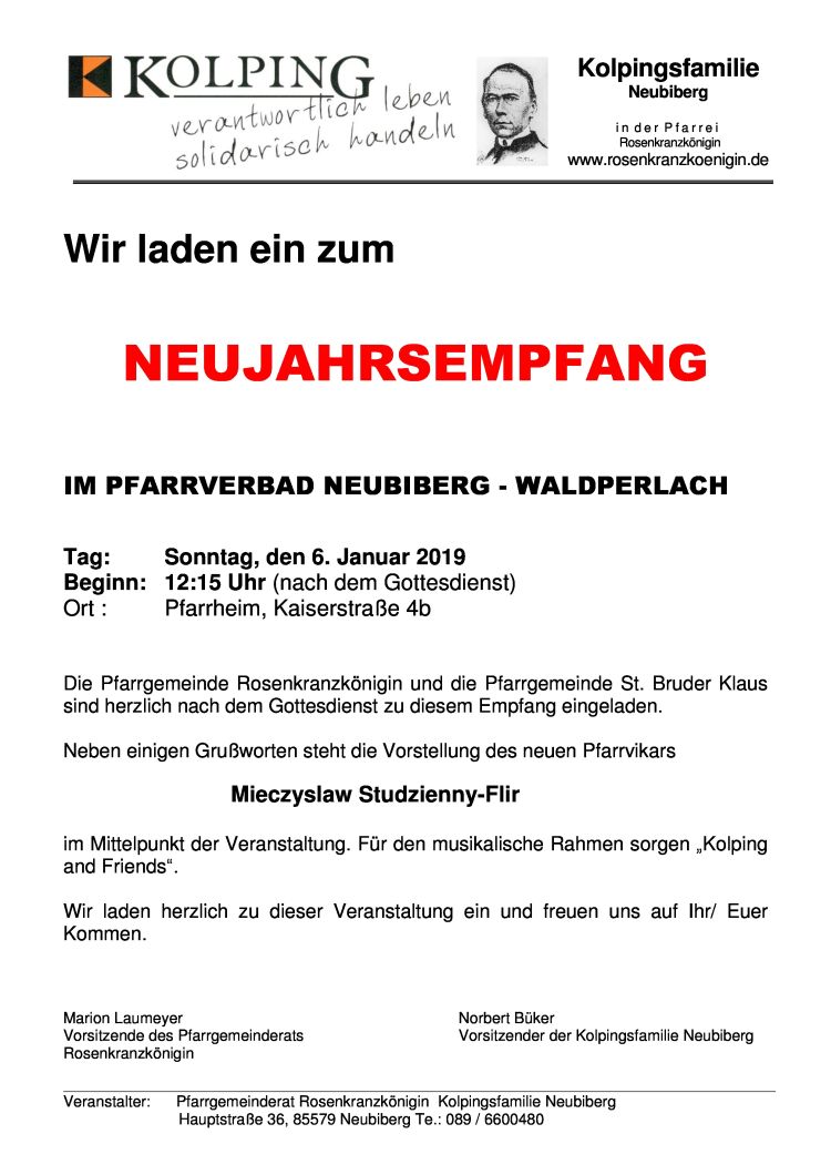 HERZLICHE EINLADUNG ZUM NEUJAHRSEMPFANG IM PFARRVERBAND NEUBIBERG-WALDPERLACH