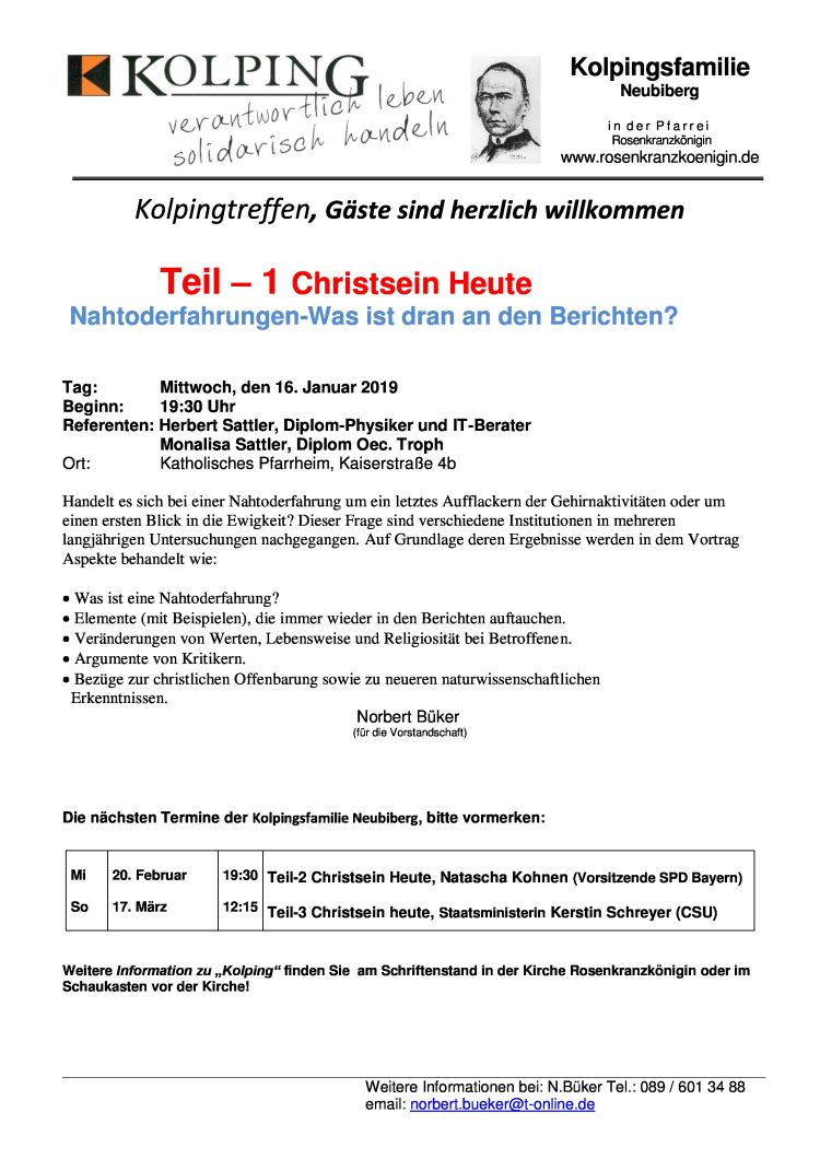 Referentin: Msgr. Christoph Huber, Präses Kolpingwerk Bayern Ort: Katholisches Pfarrheim, Kaiserstraße 4b, Neubiberg