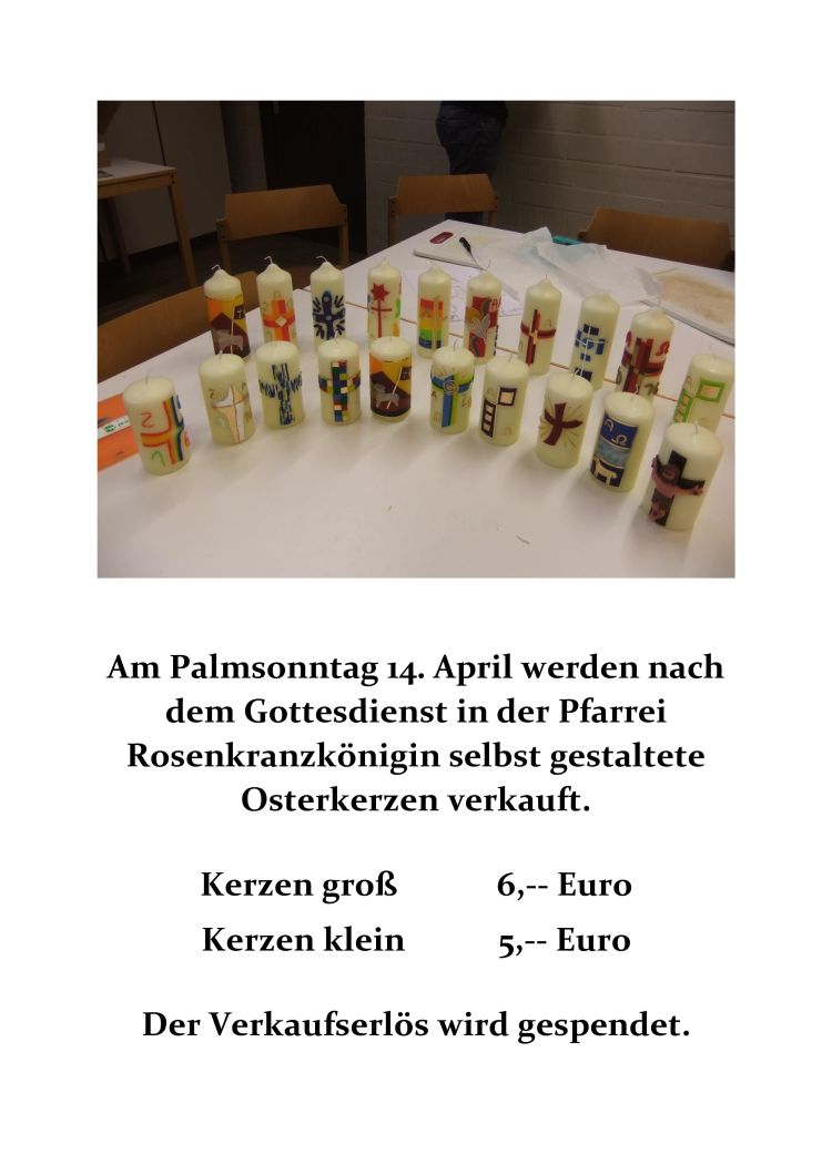 Am Palmsonntag, den 14.04.2019, werden nach dem Gottesdienst (ca. 11:15 Uhr) in der Pfarrei Rosenkranzkönigin selbst gestaltete Osterkerzen verkauft.