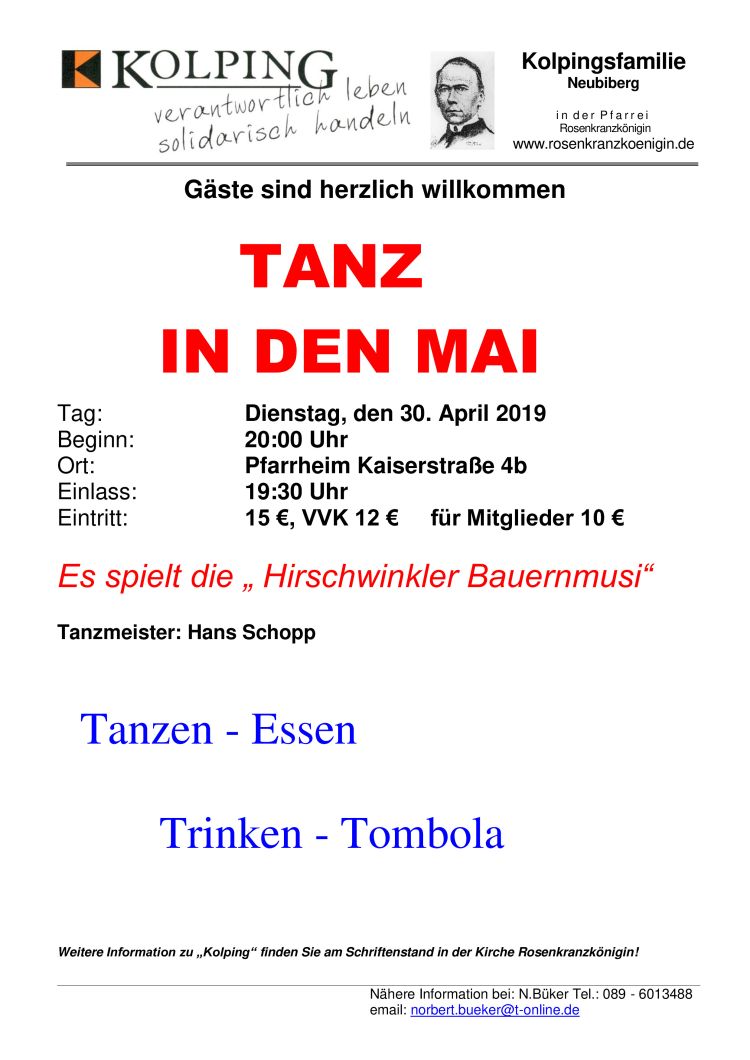 Tag: Mittwoch, den 17. Mai 2017 Beginn: 19:30 Uhr Referent: Pater Alfons Schumacher Ort: Katholisches Pfarrheim Rosenkranzkönigin, ... mehr Tag: Sonntag, den 30. April 2017 Beginn: 20:00 Uhr Ort: Pfarrheim Rosenkranzkönigin, Kaiserstraße 4b, Neubiberg Einlass: 19:30 Uhr Eintritt: 12 EUR (für Mitglieder 10 EUR)