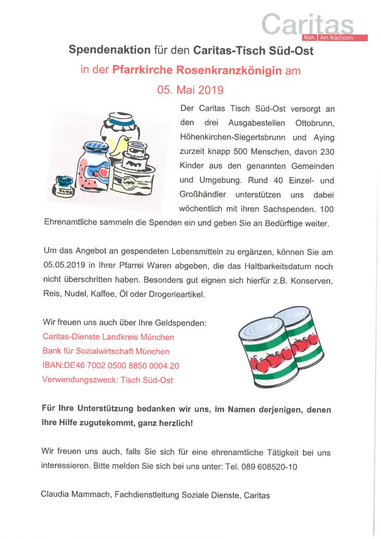 Spendenaktion für den Caritas-Tisch Süd-Ost in der Pfarrei Rosenkranzkönigin am 05.05.2019