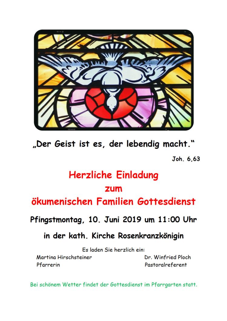 Herzliche Einladung zum ökumenischen Familiengottesdienst zum Thema "Der Geist ist es, der lebendig macht." (Joh 6,63) am Pfingstmontag, den 10.06.2019, um 11:00 Uhr in der katholischen Kirche Rosenkranzkönigin