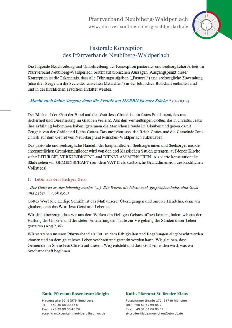 Die Beschreibung und Umschreibung der Konzeption pastoraler und seelsorglicher Arbeit im Pfarrverband Neubiberg-Waldperlach beruht auf biblischen Aussagen. Ausgangspunkt dieser Konzeption ist die Erkenntnis, dass alle Führungsaufgaben („Pastoral“) und seelsorgliche Zuwendung (also die „Sorge um die Seele des einzelnen Menschen“) in der biblischen Botschaft enthalten sind und in der kirchlichen Tradition entfaltet werden. "Macht euch keine Sorgen; denn die Freude am HERRN ist eure Stärke." (Neh 8,10c)
