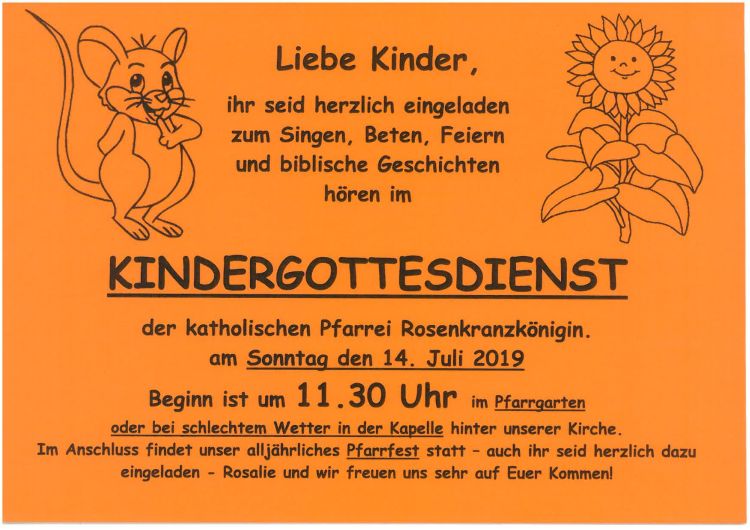 ihr seid herzlich eingeladen zum Singen, Beten, Feiern und biblische Geschichten Hören im Kindergottesdienst der katholischen Pfarrei Rosenkranzkönigin, am Sonntag, den 14. Juli 2019.