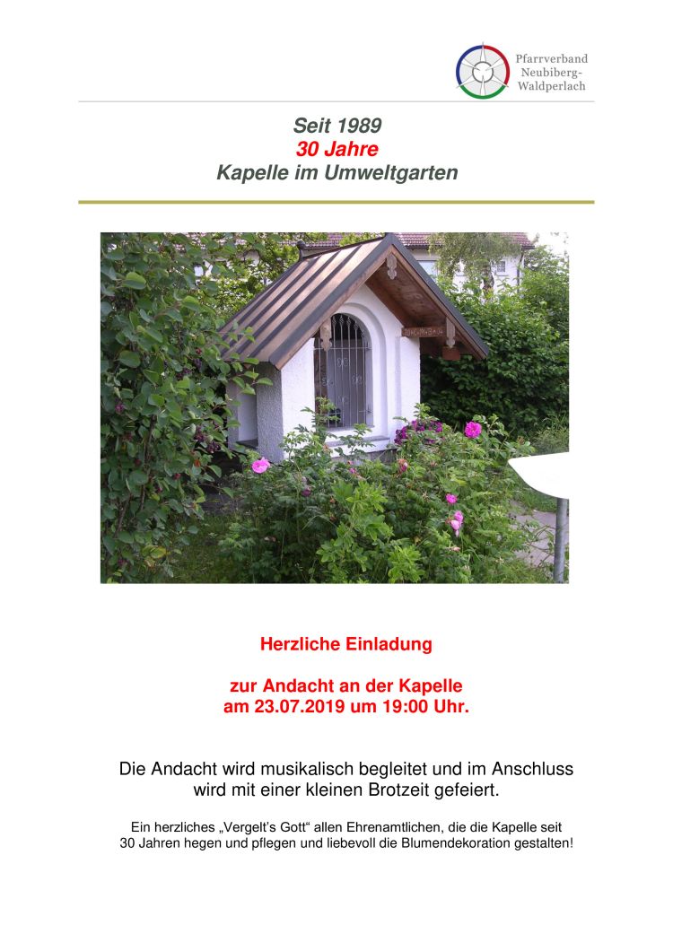 Seit 1989 gibt es die Kapelle im Umweltgarten (30 Jahre). Herzliche Einladung zur Andacht an der Kapelle am 23.07.2019 um 19:00 Uhr.