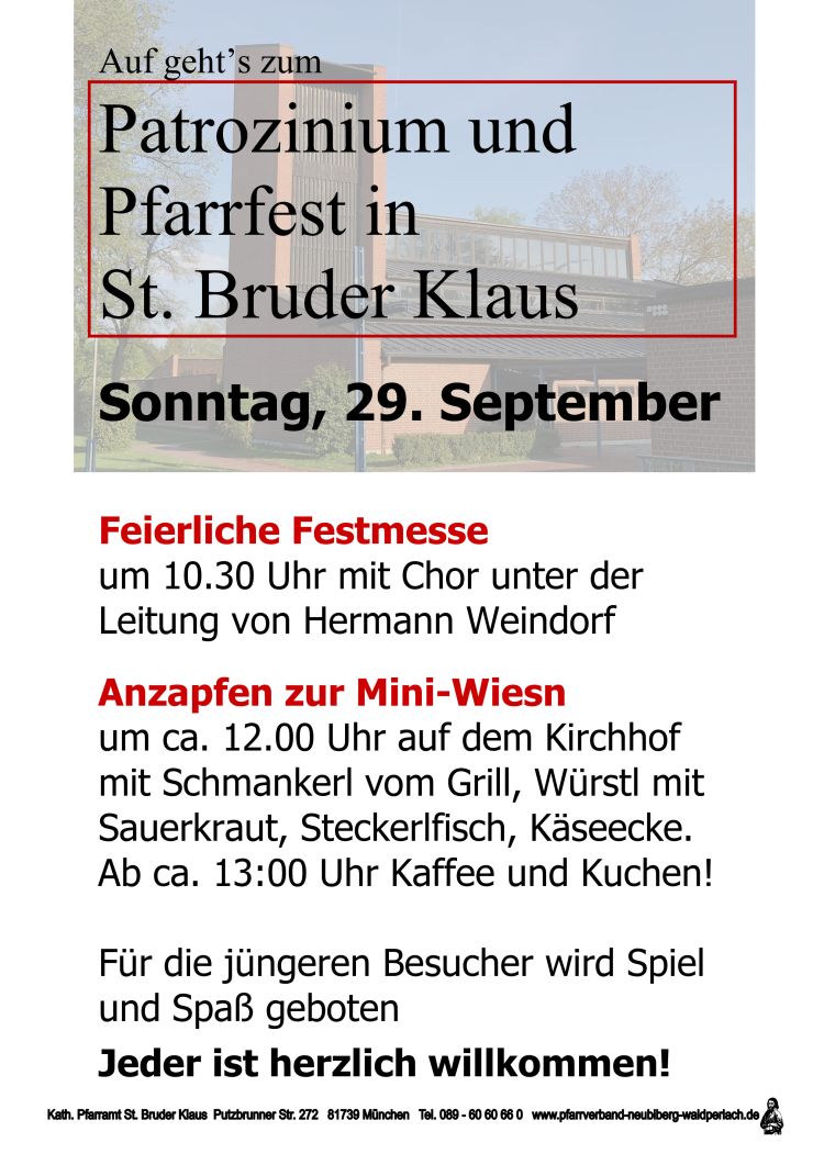 Am Sonntag, den 29. September feiert die Pfarrei St. Bruder Klaus in Waldperlach das Patrozinium. Der Festgottesdienst mit Chor beginnt um 10:30 Uhr in der Kirche St. Bruder Klaus. Um ca. 12.00 Uhr wird der gesellige Teil auf dem Kirchhof eröffnet. Die Waldperlacher Mini-Wiesn bietet Schmankerl vom Grill wie Halsgrat, Würstl mit Sauerkraut und den beliebten Steckerlfisch, ab ca. 13.00 Uhr erwartet die Gäste auch Kaffee und Kuchen. Für die jüngeren und jung gebliebenen Besucher wird Spiel und Spaß geboten, dieses Jahr mit einer Überraschung. Das Fest wird gegen 17:00 Uhr ausklingen. In der Pfarrei Rosenkranzkönigin entfällt an diesem Sonntag der Gottesdienst am Vormittag.
