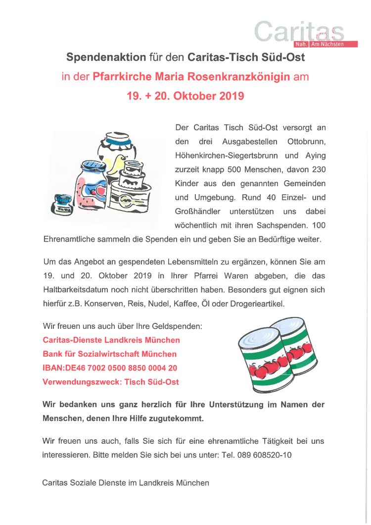 Spendenaktion für den Caritas-Tisch Süd-Ost in der Pfarrei Rosenkranzkönigin am 19./20.10.2019
