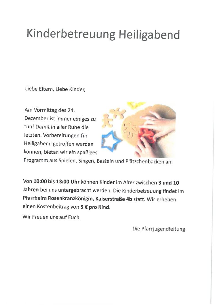 Beginn: Samstag, 26.03.2016 um ... mehr Liebe Eltern, am 24. Dezember gibt es am Vormittag immer einiges zu tun!! Bei uns wird ihr Kind bestens betreut. WO: Kath. Pfarrheim Rosenkranzkönigin, Kaiserstr. 4b WANN: 24.12. von 10:00 bis 13:00 Uhr Unkostenbeitrag: 5 EUR
