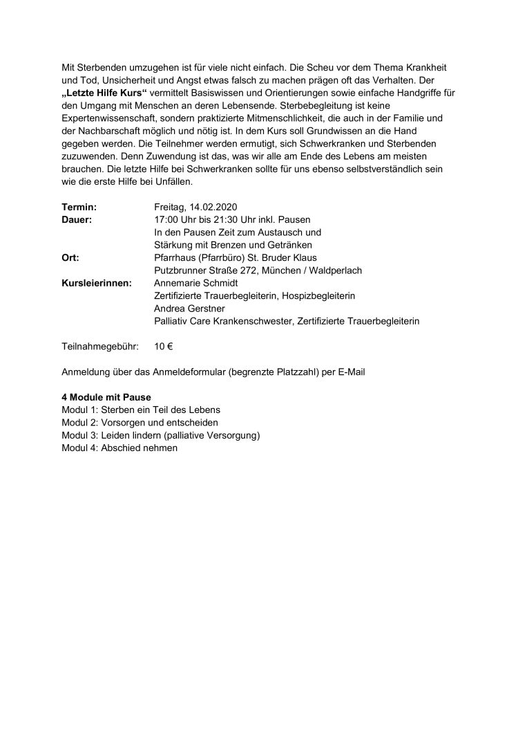 Mit Sterbenden umzugehen ist für viele nicht einfach. Die Scheu vor dem Thema Krankheit und Tod, Unsicherheit und Angst etwas falsch zu machen prägen oft das Verhalten. Der "Letzte Hilfe Kurs" vermittelt Basiswissen und Orientierungen sowie einfache Handgriffe fürden Umgang mit Menschen an deren Lebensende. Sterbebegleitung ist keine Expertenwissenschaft, sondern praktizierte Mitmenschlichkeit, die auch in der Familie und der Nachbarschaft möglich und nötig ist. In dem Kurs soll Grundwissen an die Hand gegeben werden. Die Teilnehmer werden ermutigt, sich Schwerkranken und Sterbenden zuzuwenden. Denn Zuwendung ist das, was wir alle am Ende des Lebens am meisten brauchen. Die letzte Hilfe bei Schwerkranken sollte für uns ebenso selbstverständlich sein wie die erste Hilfe bei Unfällen.