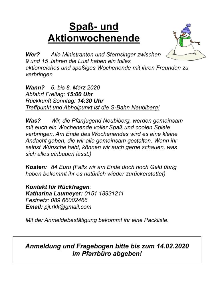 Anmeldung und Fragebogen bitte bis zum 14.02.2020 im Pfarrbüro abgeben!  Es ist Sommer, also die Zeit in der du normalerweise wunderschöne Erlebnisse mit deinen Freunden im Zeltlager sammeln kannst. Da es dieses Jahr leider kein Zeltlager geben kann, haben wir uns für euch ein paar andere Aktionen überlegt, die hoffentlich trotzdem ein wenig ... mehr Wer? Alle Ministranten und Sternsinger zwischen 9 und 15 Jahren die Lust haben ein tolles aktionreiches und spaßiges Wochenende mit ihren Freunden zu verbringen