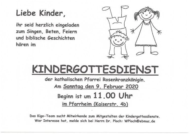 ihr seid herzlich eingeladen zum Singen, Beten, Feiern und biblische Geschichten Hören im Kindergottesdienst der katholischen Pfarrei Rosenkranzkönigin, am Sonntag, den 9. Februar 2020.