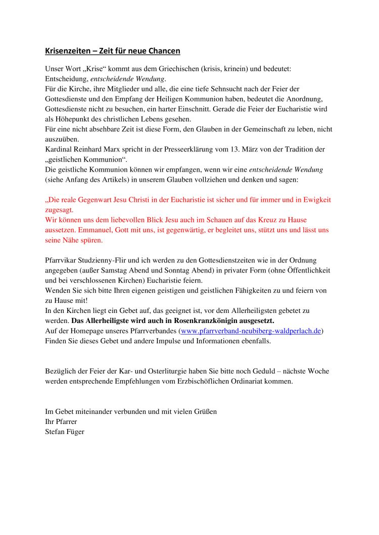 | Unser Wort „Krise“ kommt aus dem Griechischen (krisis, krinein) und bedeutet: Entscheidung, entscheidende Wendung. Für die Kirche, ihre Mitglieder und alle, die eine tiefe Sehnsucht nach der Feier der Gottesdienste und den Empfang der Heiligen Kommunion haben, bedeutet die Anordnung, Gottesdienste nicht zu besuchen, ein harter Einschnitt. Gerade die Feier der Eucharistie wird als Höhepunkt des christlichen Lebens gesehen. Für eine nicht absehbare Zeit ist diese Form, den Glauben in der Gemeinschaft zu leben, nicht auszuüben. Kardinal Reinhard Marx spricht in der Presseerklärung vom 13. März von der Tradition der „geistlichen Kommunion“. Die geistliche Kommunion können wir empfangen, wenn wir eine entscheidende Wendung (siehe Anfang des Artikels) in unserem Glauben vollziehen und denken und sagen: