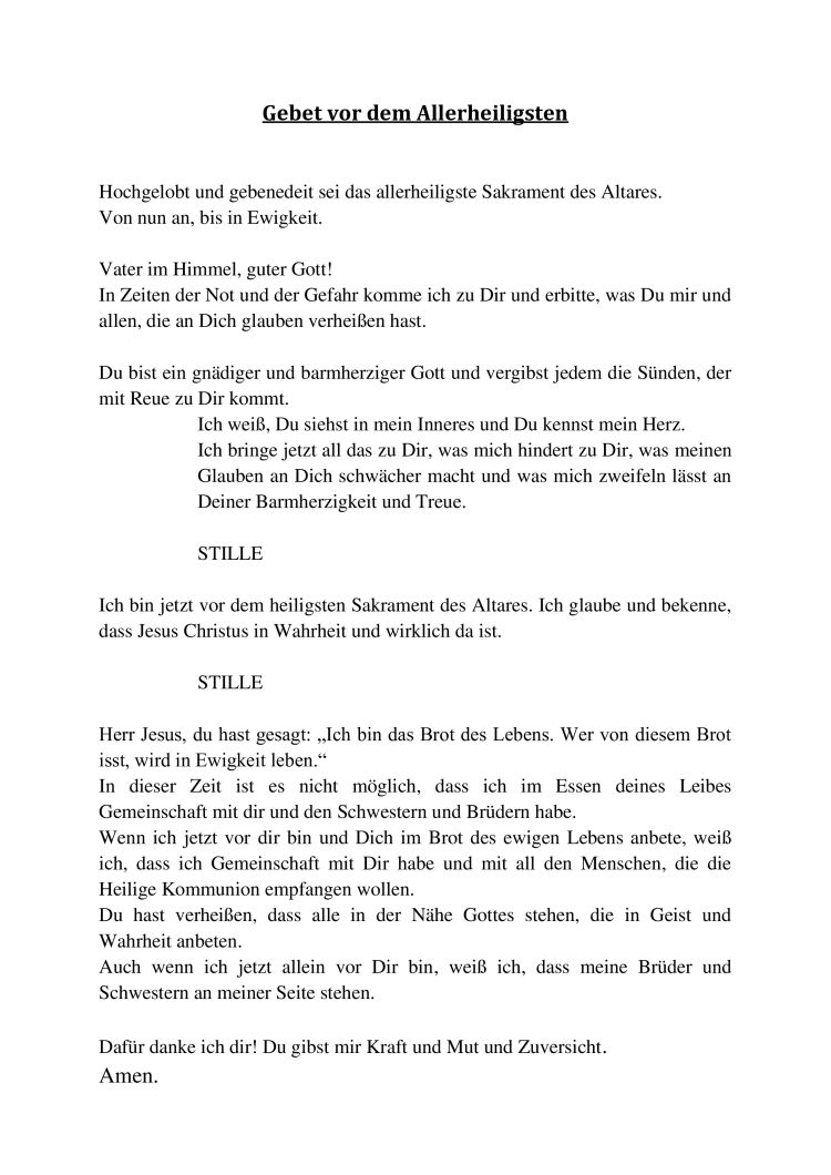 Herr Jesus, du hast gesagt: „Ich bin das Brot des Lebens. Wer von diesem Brot isst, wird in Ewigkeit leben.“ In dieser Zeit ist es nicht möglich, dass ich im Essen deines Leibes Gemeinschaft mit dir und den Schwestern und Brüdern habe. Wenn ich jetzt vor dir bin und Dich im Brot des ewigen Lebens anbete, weiß ich, dass ich Gemeinschaft mit Dir habe und mit all den Menschen, die die Heilige Kommunion empfangen wollen. Du hast verheißen, dass alle in der Nähe Gottes stehen, die in Geist und Wahrheit anbeten. Auch wenn ich jetzt allein vor Dir bin, weiß ich, dass meine Brüder und Schwestern an meiner Seite stehen.