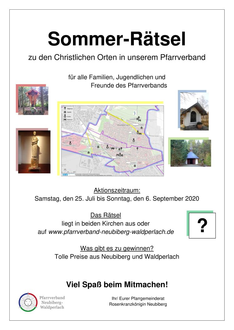 Für alle Familien, Jugendlichen und Freunde des Pfarrverbands bieten wir ein Sommer-Räzsel zu den Christlichen Orten im Pfarrverband an. Das Rätsel liegt in beiden Kirchen aus oder hier auf der Homepage. Aktionszeitraum: Samstag, den 25. Juli bis Sonntag, den 6. September 2020