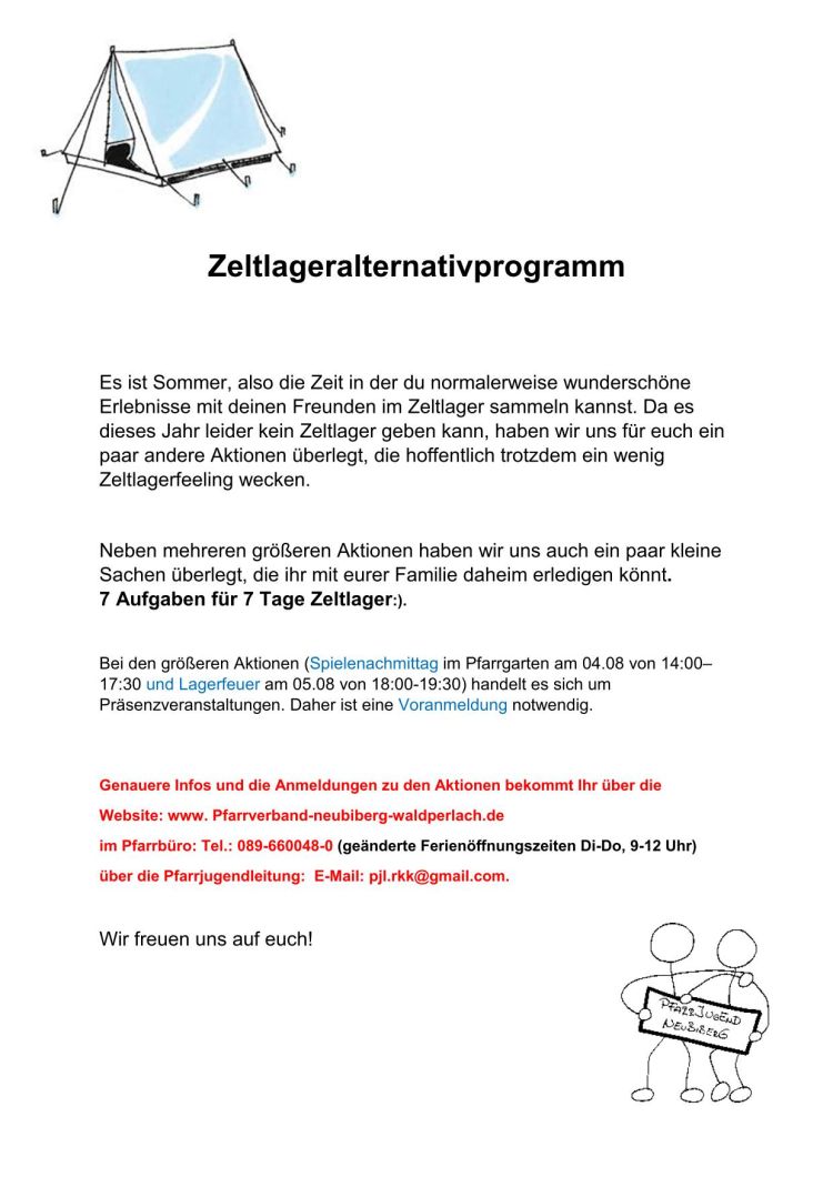 Es ist Sommer, also die Zeit in der du normalerweise wunderschöne Erlebnisse mit deinen Freunden im Zeltlager sammeln kannst. Da es dieses Jahr leider kein Zeltlager geben kann, haben wir uns für euch ein paar andere Aktionen überlegt, die hoffentlich trotzdem ein wenig Zeltlagerfeeling wecken. Neben mehreren größeren Aktionen haben wir uns auch ein paar kleine Sachen überlegt, die ihr mit eurer Familie daheim erledigen könnt. 7 Aufgaben für 7 Tage Zeltlager Bei den größeren Aktionen (Spielenachmittag im Pfarrgarten am 04.08 von 14:00 bis 17:30 und Lagerfeuer am 05.08 von 18:00 bis 19:30) handelt es sich um Präsenzveranstaltungen. Daher ist eine Voranmeldung notwendig.