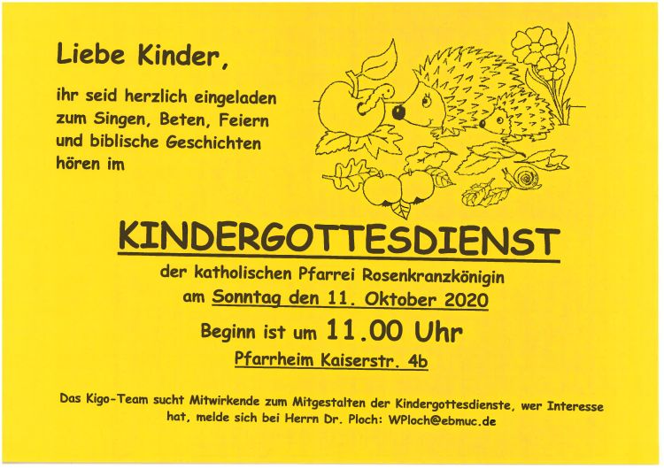 Das Kigo-Team sucht Mitwirkende zum Mitgestalten der Kindergottesdienste. Wer Interesse hat, melde sich bei Herrn Dr. Ploch, wploch@ebmuc.de
