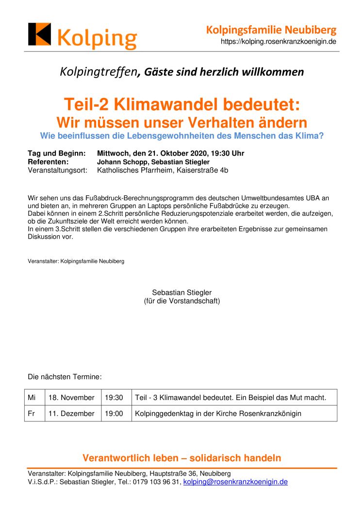 Referentin: Msgr. Christoph Huber, Präses Kolpingwerk Bayern Ort: Katholisches Pfarrheim, Kaiserstraße 4b, Neubiberg