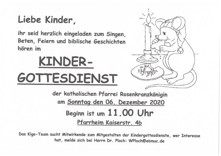 Das Kigo-Team sucht Mitwirkende zum Mitgestalten der Kindergottesdienste. Wer Interesse hat, melde sich bei Herrn Dr. Ploch, wploch@ebmuc.de
