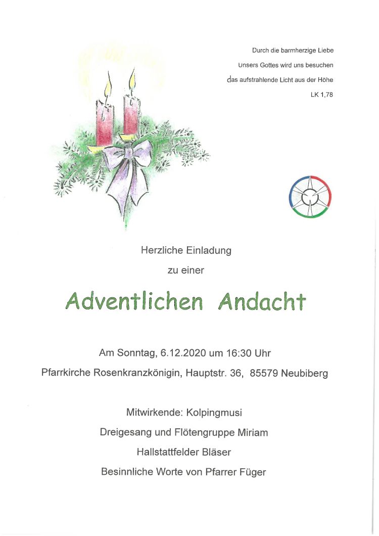 Herzliche Einladung zu einer Adventlichen Andacht am Sonntag, 6.12.2020 um 16:30 Uhr, in der Pfarrkirche Rosenkranzkönigin, Hauptstraße 36, 85579 Neubiberg.