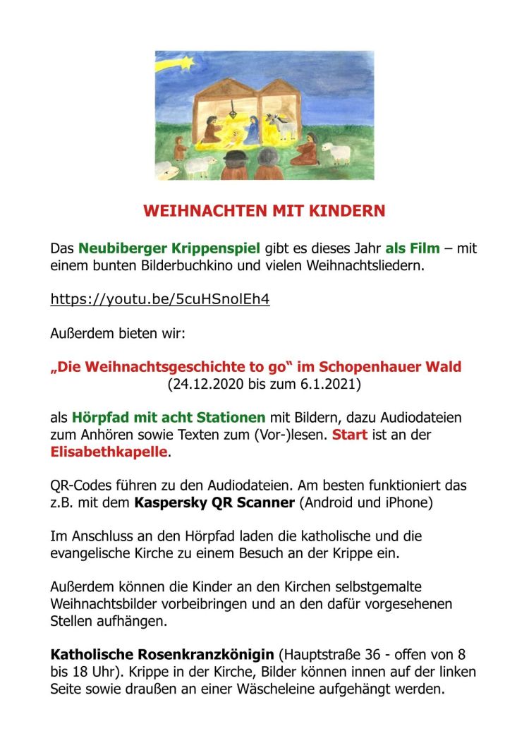 "Die Weihnachtsgeschichte to go" im Schopenhauer Wald (24.12.2020 bis zum 6.1.2021) als Hörpfad mit acht Stationen mit Bildern, dazu Audiodateien zum Anhören sowie Texten zum (Vor-)lesen. Start ist an der Elisabethkapelle.