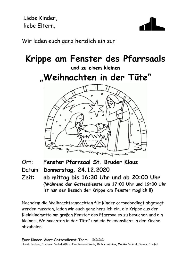 Nachdem die Weihnachtsandachten für Kinder coronabedingt abgesagt werden mussten, laden wir Euch ganz herzlich ein, die Krippe aus der Kleinkindmette am großen Fenster des Pfarrsaales zu besuchen und ein kleines "Weihnachten in der Tüte" und ein Friedenslicht in der Kirche abzuholen.