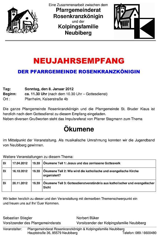 HERZLICHE EINLADUNG ZUM NEUJAHRSEMPFANG IM PFARRVERBAND NEUBIBERG-WALDPERLACH Am Sonntag, den 8. Januar 2017 ab ca. 11:45 Uhr (nach dem 10:30 Uhr-Gottesdienst) im Pfarrheim Rosenkranzkönigin, Kaiserstraße 4b, Neubiberg Die Pfarrgemeinde Rosenkranzkönigin und die Pfarrgemeinde St. ... mehr