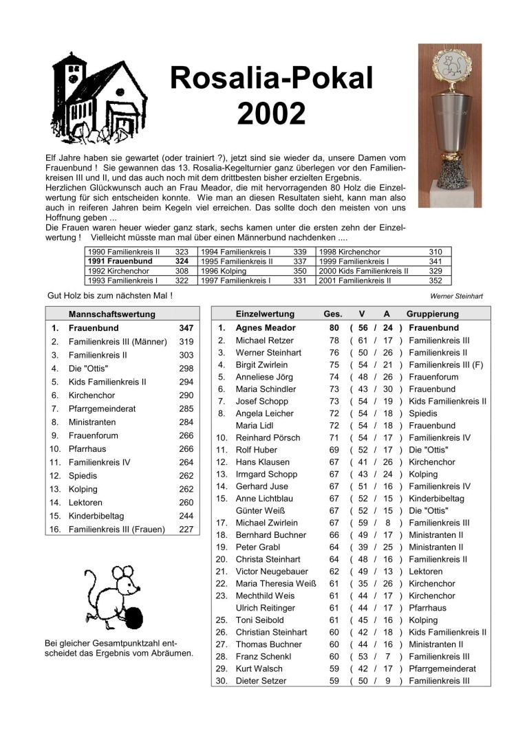 | Der Rosaliapokal wird seit 1990 jährlich an den ersten Wochenenden im Jahr ausgetragen. Teilnehmer sind Teams aus kirchlichen Gruppen bestehend aus 5 Teilnehmerinnen/Teilnehmern. Jede Teilnehmerin/Jeder Teilnehmer hat insgesamt 20 Schübe: 10 mal auf die Vollen und 10 mal auf Abräumen. Im Jahr 2002 konnte der Frauenbund mit 347 Holz den Pokal gewinnen. |