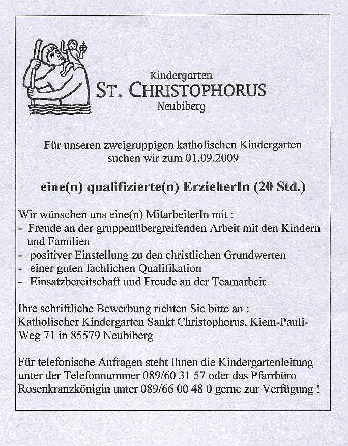 Ihre schriftliche Bewerbung richten Sie bitte an: Katholischer Kindergarten Sankt Christophorus Kiem-Pauli-Weg 71 85579 Neubiberg |