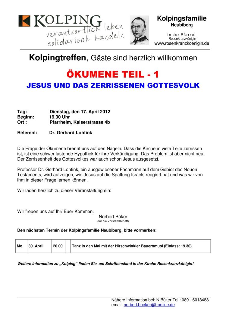 Tag:              Mittwoch, den 15. Oktober 2014   Beginn:  19:30 Uhr Ort :              Pfarrheim, Kaiserstraße 4b Referent:        Professor Dr. Hermann Rumschöttel Eintritt frei Papst Franziskus hat die Gläubigen aufgefordert, "an die ... mehr