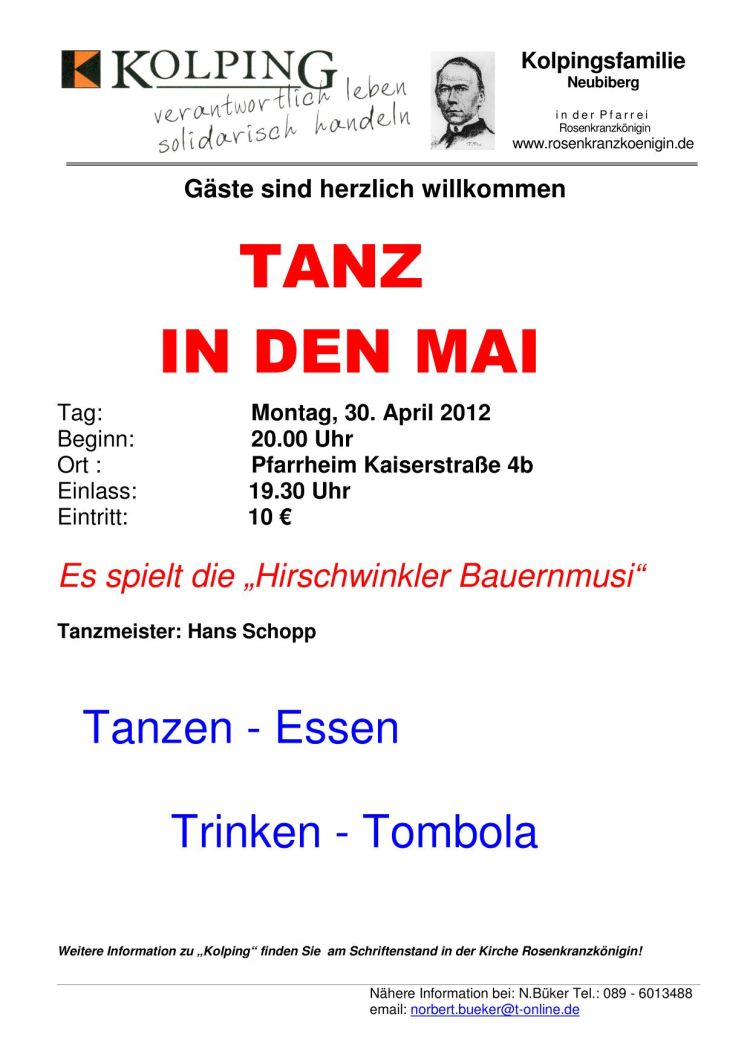Tag: Dienstag, den 30. April 2013 Beginn: 20.00 Uhr Ort: Pfarrheim Kaiserstraße 4b Einlass: 19.30 Uhr Eintritt: 10 EUR     Es spielt die "Hirschwinkler Bauernmusi". Programm: Tanzen, Essen, Trinken, Tombola. Weitere Informationen finden Sie am Schriftenstand in der Kirche ... mehr