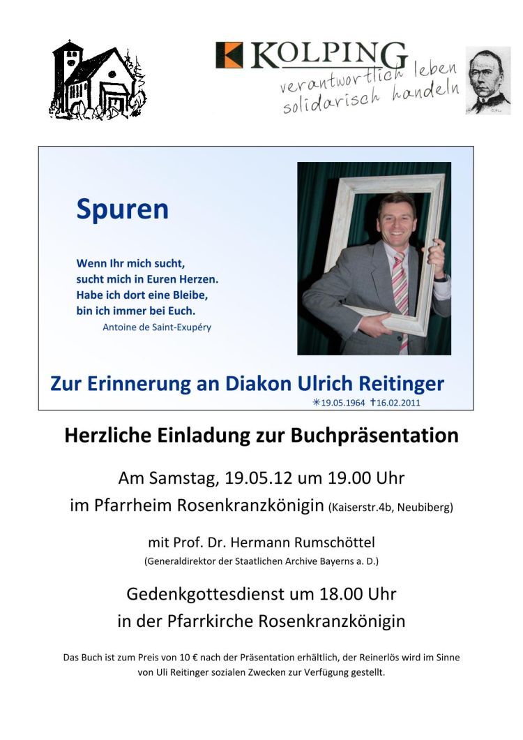 Ab Montag kann in den beiden Pfarrbüros das Buch "Spuren von Diakon Ulrich Reitinger" ab 10 EUR erworben werden. Der Reinerlös wird im Gedenken an Ulrich Reitinger einem sozialen Projekt zugeführt.