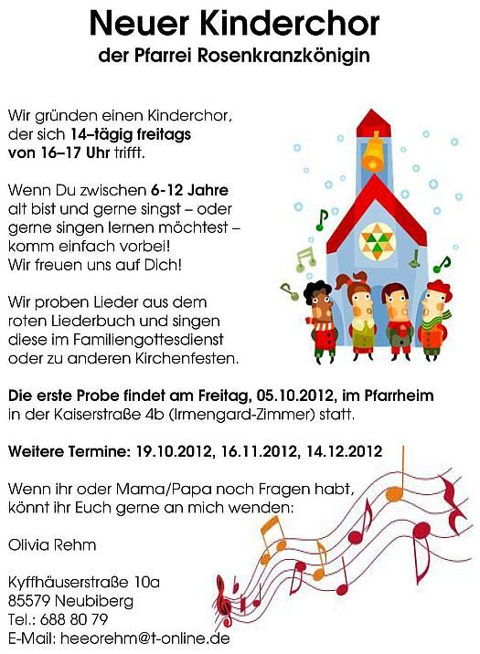 Die erste Probe findet am Freitag, 05.10.2012, im Pfarrheim in der Kaiserstraße 4b (Irmengard-Zimmer) statt.