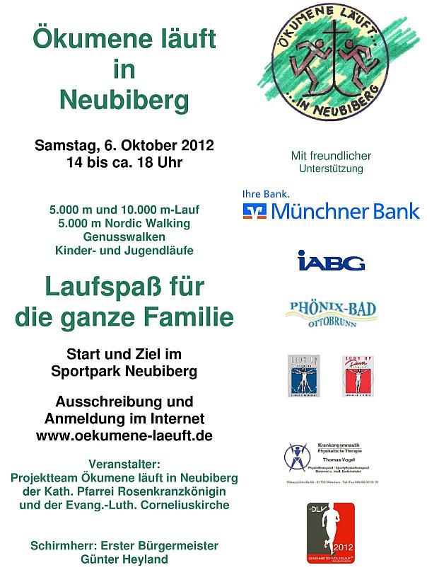 Am 6. Oktober heißt es wieder "Ökumene läuft" - bereits zum siebten Mal findet das ökumenische Laufereignis heuer statt. Es beginnt um 14 Uhr im Sportpark Neubiberg. Die Kinder beginnen mit kleineren Wettkämpfen im Stadion, bevor es um ca. 14.45 Uhr für die Erwachsenen an den Start zu den Läufen im Landschaftspark Hachinger Tal geht. Die ambitionierten Läufer haben eine Strecke von 10.000m oder von 5000m vor sich, Nordic Walker absolvieren die 5000m. Für die, die einfach nur ohne Hetze und Wettkampf mitmachen wollen, bieten die Veranstalter wieder den Lauf für die Genusswalker an - freie Streckenwahl und eine Schlussrunde im Stadion.