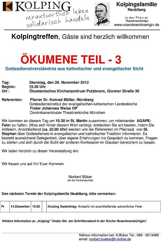 Eintritt frei ... mehr Wir kommen am 20.11.2012 um 19.30 in St. Martin zusammen, um miteinander AGAPE- Feier zu halten. (Was sich hinter diesem Wort verbirgt, entdecken Sie am besten, indem Sie mitfeiern.) Anschließend (ca. 20.00 Uhr) werden uns die Referenten im Pfarrsaal von St. Stephan über Gottesdienste ... mehr Ab Montag kann in den beiden Pfarrbüros das Buch "Spuren von Diakon Ulrich Reitinger" ab 10 EUR erworben werden. Der Reinerlös wird im Gedenken an Ulrich Reitinger einem sozialen Projekt zugeführt.  Die gesamte Pfarrgemeinde von Rosenkranzkönigin und St. Bruder Klaus sind gerne nach dem Gottesdienst ins Pfarrheim eingeladen. U.a. werden Neuigkeiten um das Thema "Ökumene" von Herrn Pfarrer Stegmann vorgestellt. |