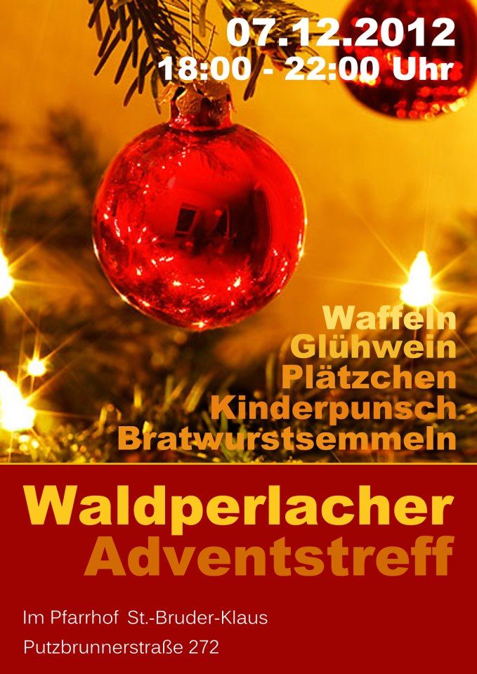 Am Freitag, 7. Dezember 2012, ab 18 Uhr findet im Pfarrhof der Waldperlacher Adventstreff statt. Gemütliche Adventsstimmung bei flackerndem Feuer, Bratwürschten, Waffeln, Platzerl und Glühwein.