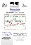 Ort: Pfarrsaal St. Bruder Klaus, Putzbrunner Straße 272 Datum: Sonntag, 24.02.2013 Uhrzeit: 09.30 Uhr (Bitte pünktlich!) ... mehr Thema: "Knüpfe dein Band mit Künstlerhand"