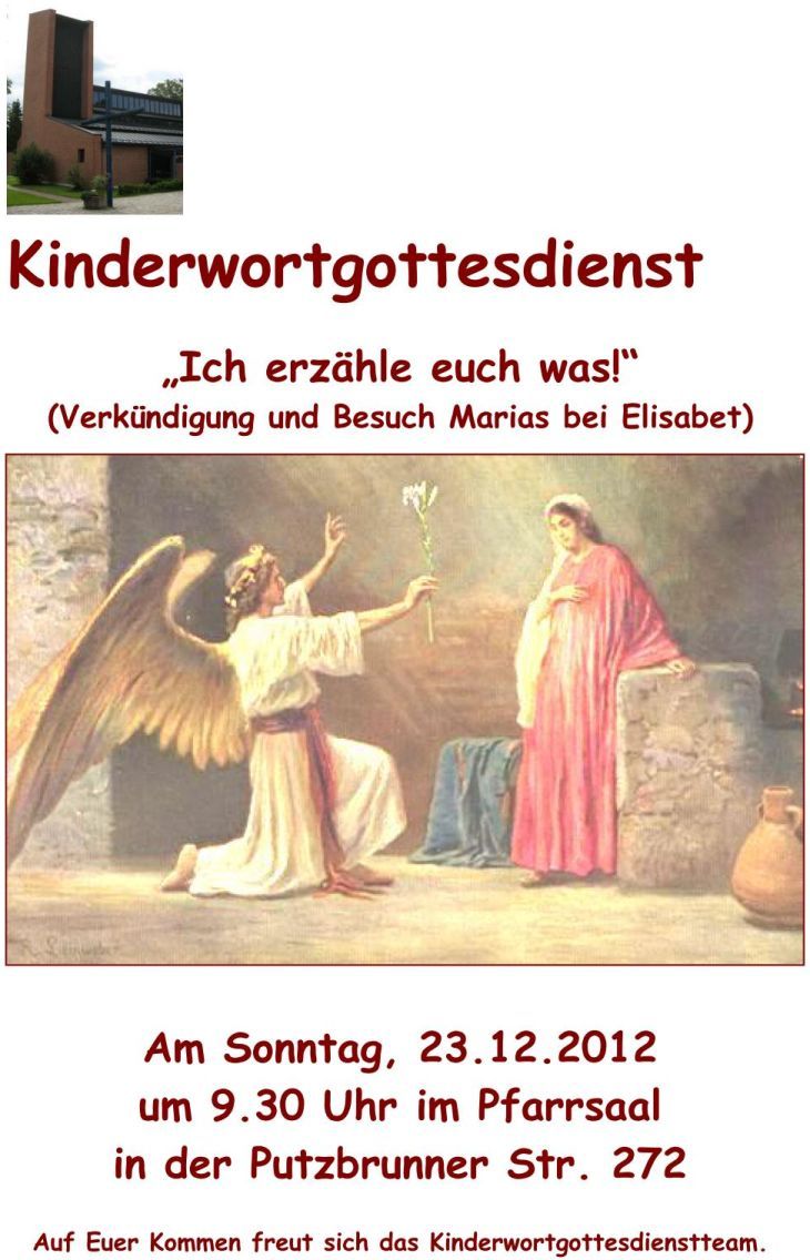 Kinderwortgottesdienst am Sonntag, 23.12.2012, um 9.30 Uhr im Pfarrsaal in der Putzbrunner Str. 272 zum Thema "Ich erzähle euch was!" (Verkündigung und Besuch Marias bei Elisabet)