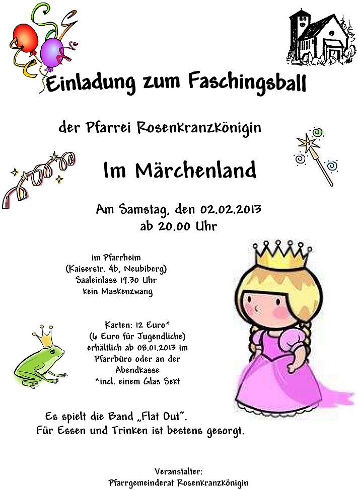 Einladung zum Faschingsball der Pfarrei Rosenkranzkönigin unter dem Motto "Im Märchenland" am Samstag, den 02.02.2013, ab 20.00 Uhr im Pfarrheim (Kaiserstraße 4b, Neubiberg)