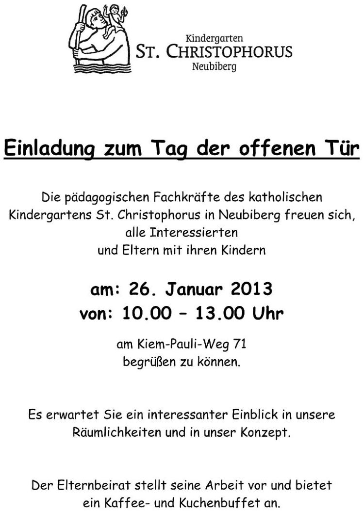 Die pädagogischen Fachkräfte des katholischen Kindergartens St. Christophorus in Neubiberg freuen sich, alle Interessierten und Eltern mit ihren Kindern am 26. Januar 2013 von 10.00 Uhr bis 13.00 Uhr am Kiem-Pauli-Weg 71 begrüßen zu können.