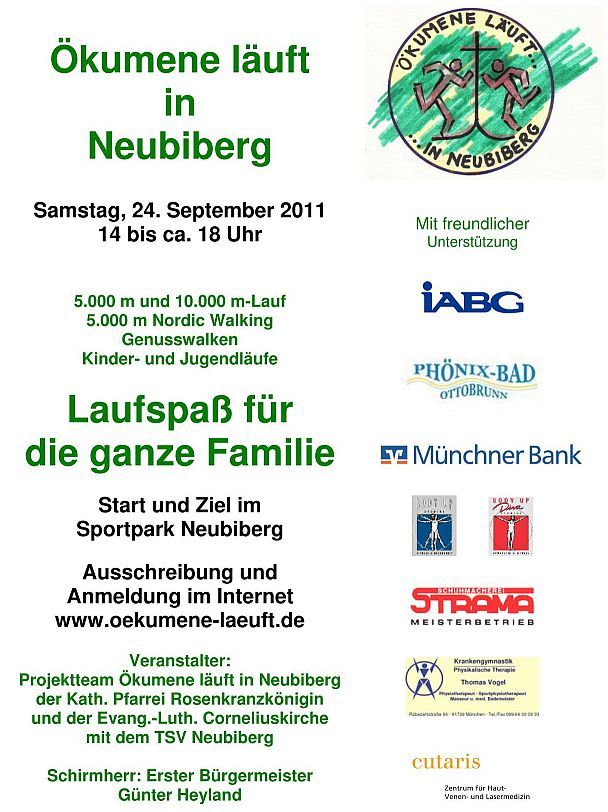 Veranstalter: Projektteam Ökumene läuft in Neubiberg der Kath. Pfarrei Rosenkranzkönigin und der Evang.-Luth. Corneliuskirche mit dem TSV Neubiberg