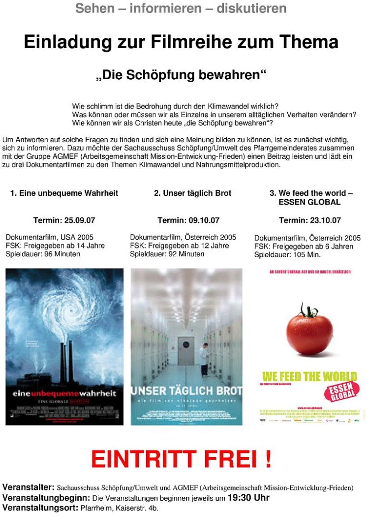 | Veranstalter: Sachausschuss Schöpfung/Umwelt und AGMEF (Arbeitsgemeinschaft Mission-Entwicklung-Frieden) |