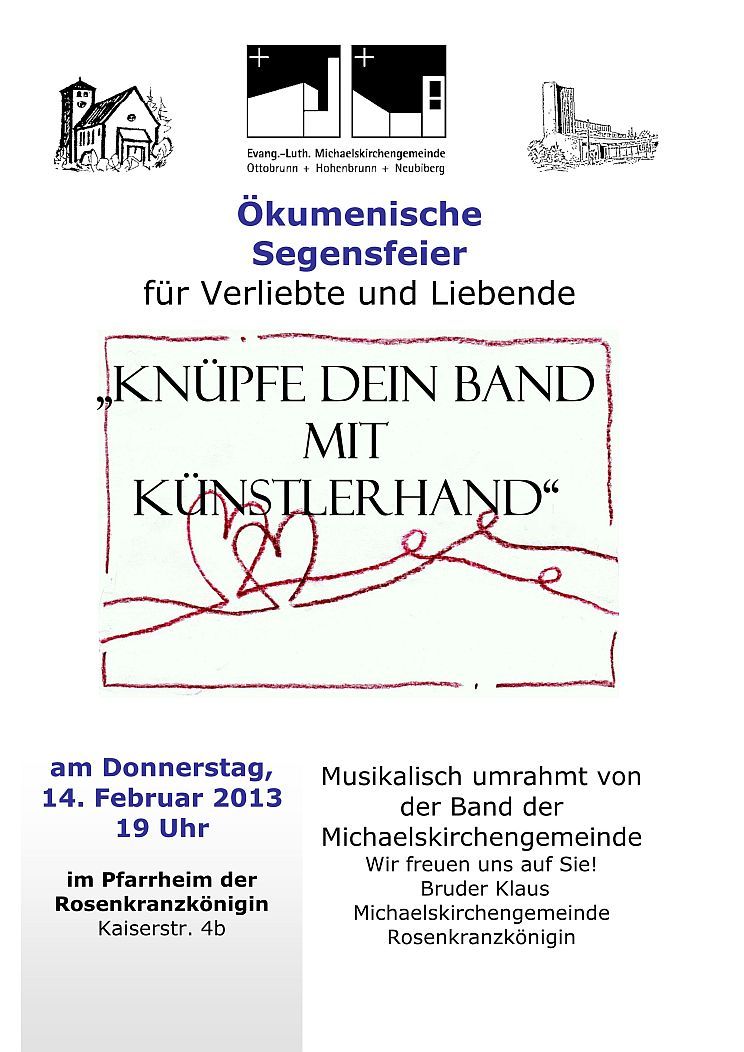 Auch heuer laden die Kirchengemeinden zu einem ökumenischen Segnungsgottesdienst am Valentinstag (Donnerstag, der 14. Februar, 19:00 im Pfarrheim der Rosenkranzkönigin, Neubiberg) ein. Insbesondere die Paare mit dem 7., 25., 50. und 60. Ehejubiläum, aber auch alle anderen Liebenden und Verliebten. Der Abend wird von Vikarin Susanne Spinnler und Pastoralreferent Winfried Ploch und einem ehrenamtlichen Team gestaltet. Mit dem Motto ?Knüpfe dein Band mit Künstlerhand? werden wir hören von dem Band der Liebe, das eine Beziehung zusammenhält. Aber auch solche Bändern, die uns einengen oder an uns zerren sollen zur Sprache kommen.