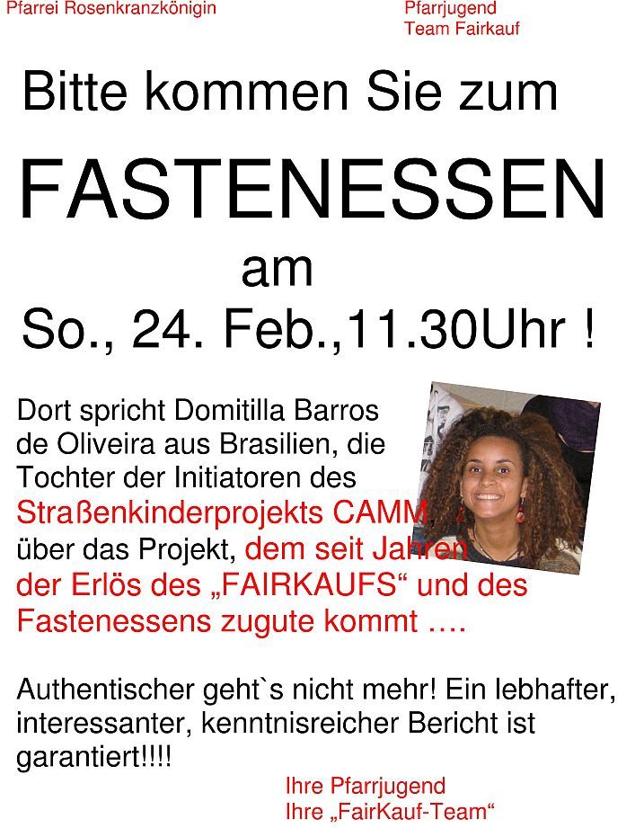 Dort spricht Domitilla Barros de Oliveira aus Brasilien, die Tochter der Initiatoren des Straßenkinderprojekts CAMM, über das Projekt, dem seit Jahren der Erlös des "FAIRKAUFS" und des Fastenessens zugute kommt ....