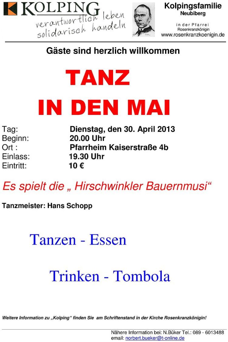Tag: Dienstag, den 30. April 2013 Beginn: 20.00 Uhr Ort: Pfarrheim Kaiserstraße 4b Einlass: 19.30 Uhr Eintritt: 10 EUR     Es spielt die "Hirschwinkler Bauernmusi". Programm: Tanzen, Essen, Trinken, Tombola. Weitere Informationen finden Sie am Schriftenstand in der Kirche ... mehr