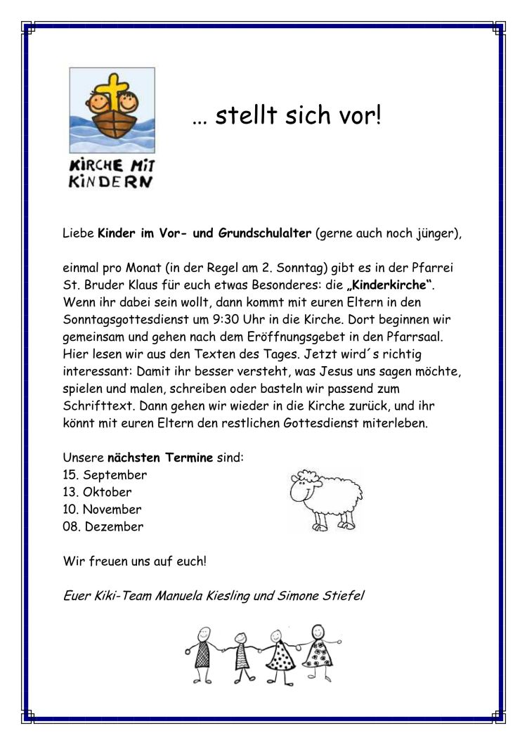 einmal pro Monat (in der Regel am 2. Sonntag) gibt es in der Kirche St. Bruder Klaus für euch etwas Besonderes: Die "Kinderkirche". Wenn ihr dabei sein wollt, dann kommt mit euren Eltern in den Sonntagsgottesdienst um 09.30 Uhr in die Kirche. Dort beginnen wir gemeinsam und gehen nach dem Eröffnungsgebet in den Pfarrsaal. Dort lesen wir aus den Texten des Tages. Jetzt wird's richtig interessant: Damit ihr besser versteht, was Jesus uns sagen möchte, spielen und malen, schreiben oder basteln wir passend zum Schrifttext. Dann gehen wir wieder in die Kirche zurück und ihr könnt mit euren Eltern den restlichen Gottesdienst miterleben.