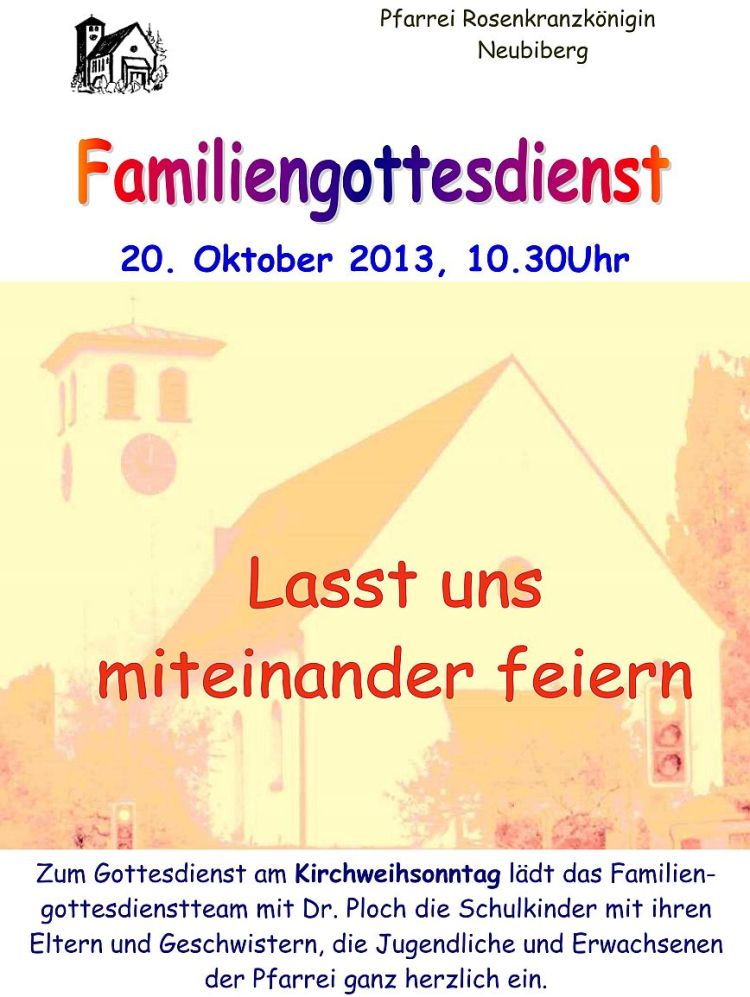 Familiengottesdienst am 20.10.2013 um 10.30 Uhr zum Thema "Lasst uns miteinander feiern". Zum Gottesdienst am Kirchweihsonntag lädt das Familiengottesdienstteam mit Dr. Ploch die Schulkinder mit ihren Eltern und Geschwistern, die Jugendliche und Erwachsenen des Pfarrverbands ganz herzlich ein.